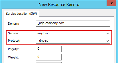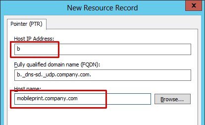 In addition to a delegation DNS record for the single “mobileprint.company.com” subdomain as outlined in the previous section, create DNS-SD discovery record in Windows DNS.