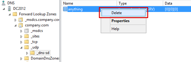 - There should now be an _dns-sd folder under _udp. Delete the “Anything” SRV record from within the _dns-sd folder that was created.