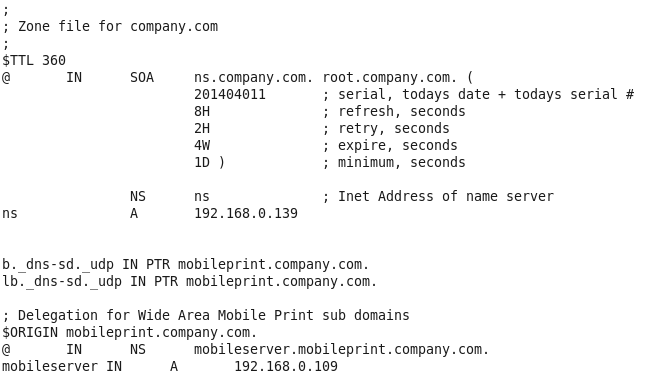 In addition to a delegation DNS record for the single “mobileprint.company.com” subdomain as outlined in section 3.18.4.2 Configure BIND , create DNS-SD discovery record in BIND.