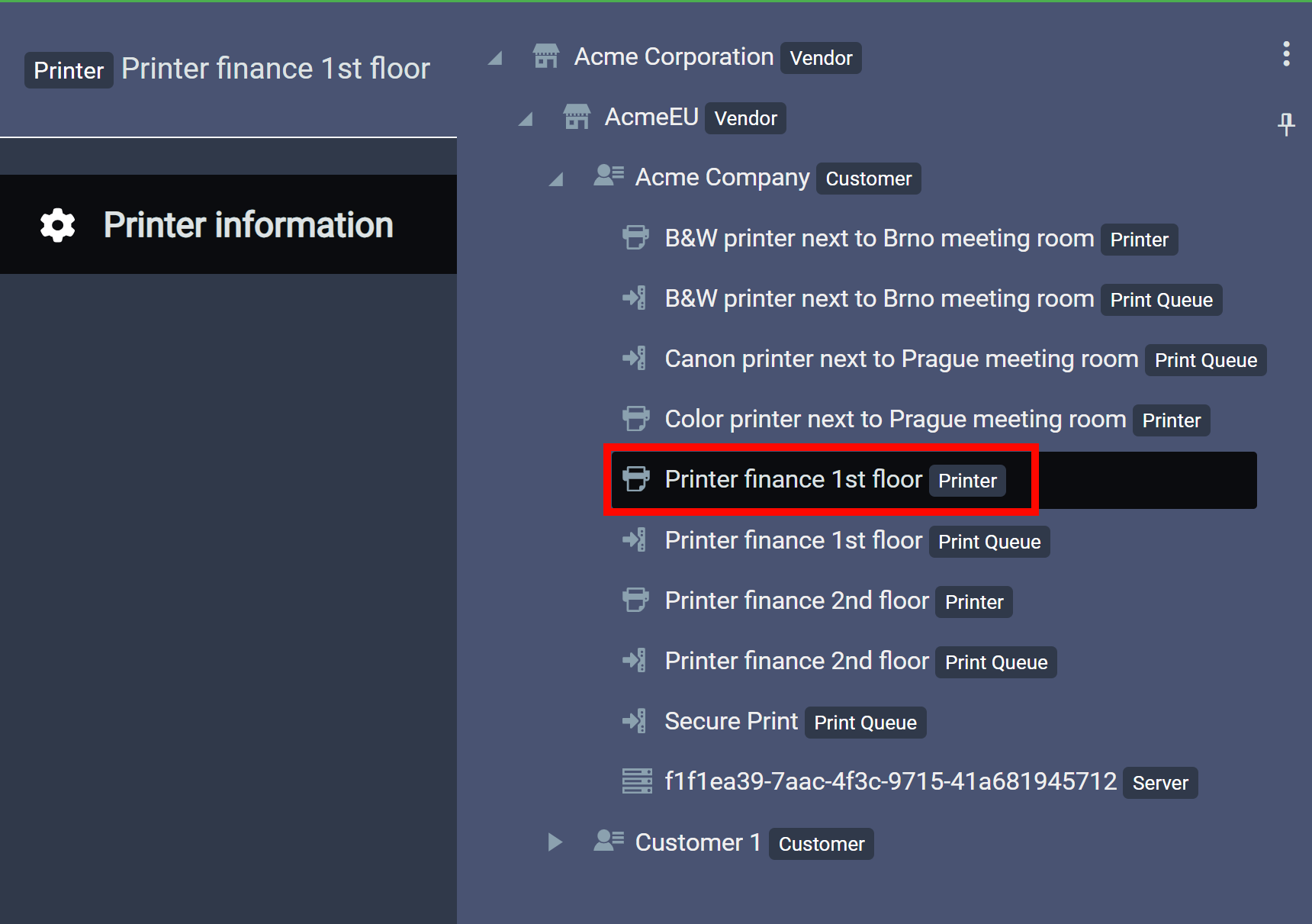 MFDs appear in the Dispatcher Paragon Cloud system tree as sub-nodes of the account. Selecting the MFD in the tree displays the sub-menu.