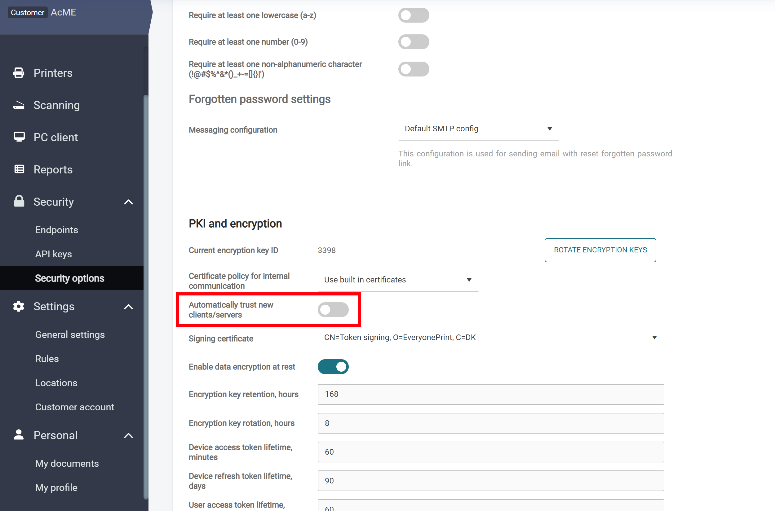 Note that if the option to Automatically trust new clients/servers is disabled in the PKI and encryption section under Security > Security options menu of Dispatcher Paragon Cloud Web UI, you will need to authorize each end user's Dispatcher Paragon Cloud Client in Security > Endpoints.