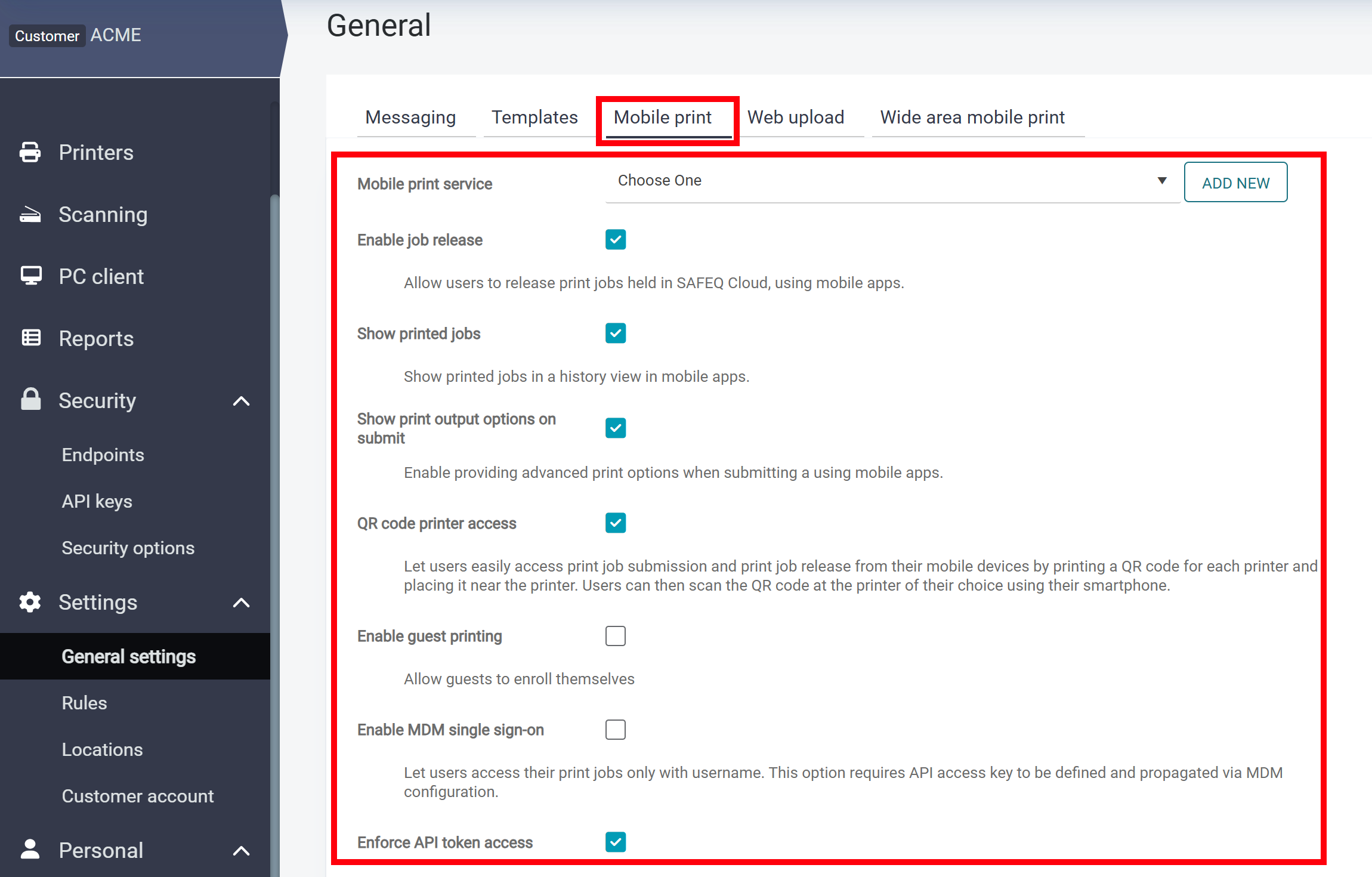 Go to Settings > General settings > Mobile print.