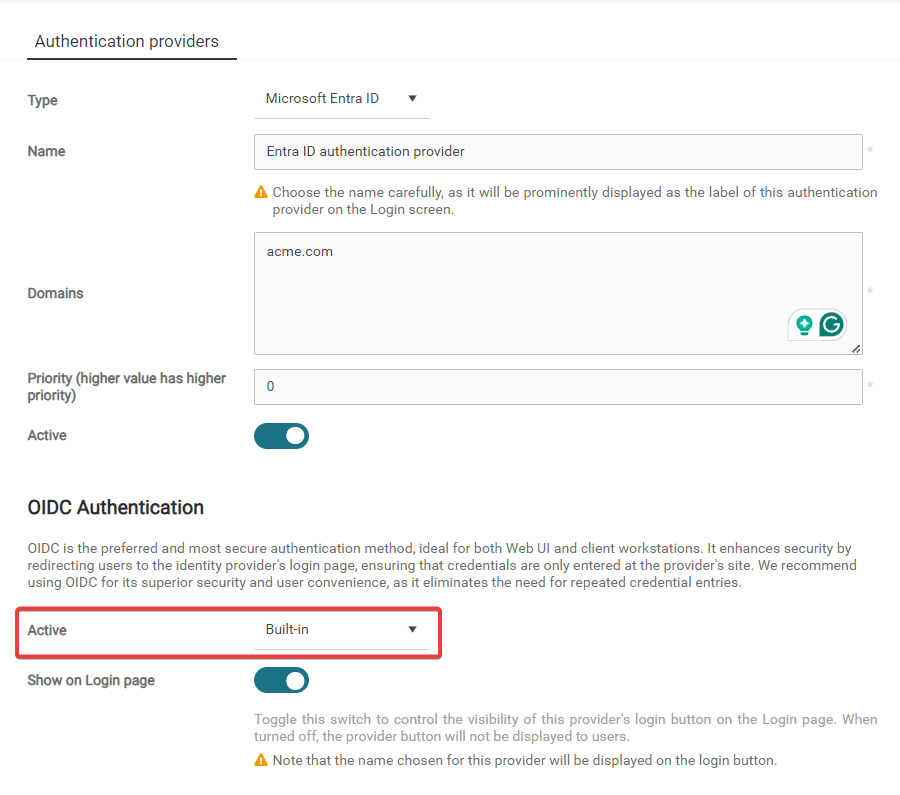 In the OIDC Authentication section, enable the built-in OIDC by selecting Built-in from the dropdown list.