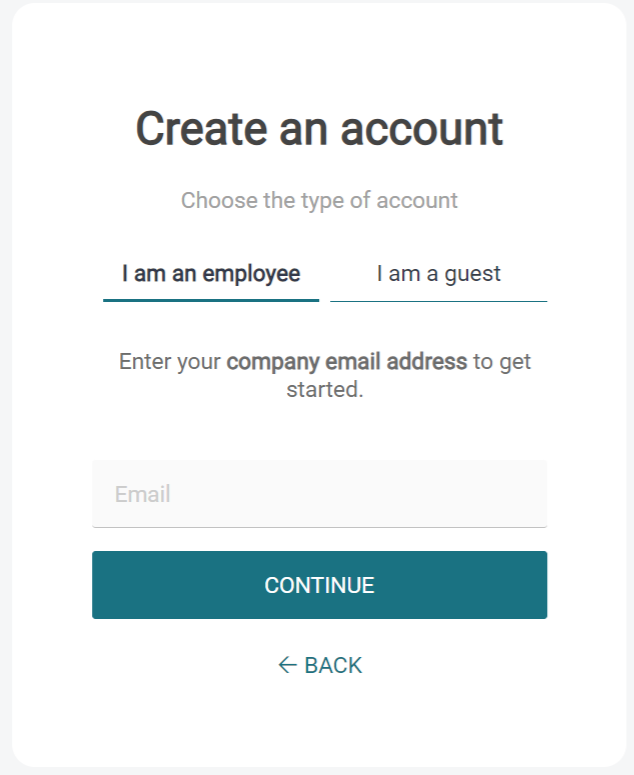 On the following screen (Create an account), enter your company email address. If the screen has two tabs, enter your email address on the I am an employee tab.