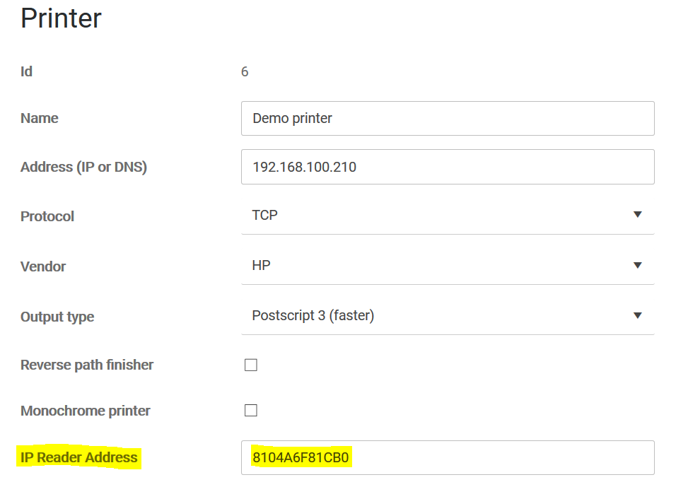 Edit Printer Settings in Dispatcher Paragon Cloud to add MAC ID of Ethernet 241 controller on Printer/MFD where ‘swipe-and-release’ feature has to be used