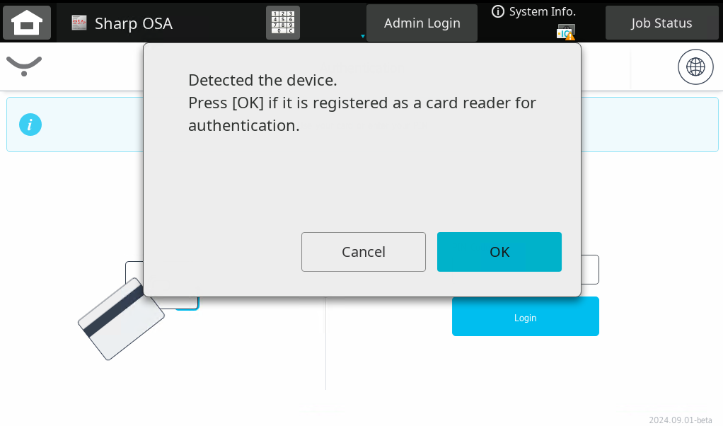 Connect the card reader to the MFD. A prompt to enable it will appear. Tap Administrator Login and log in as machine administrator.
