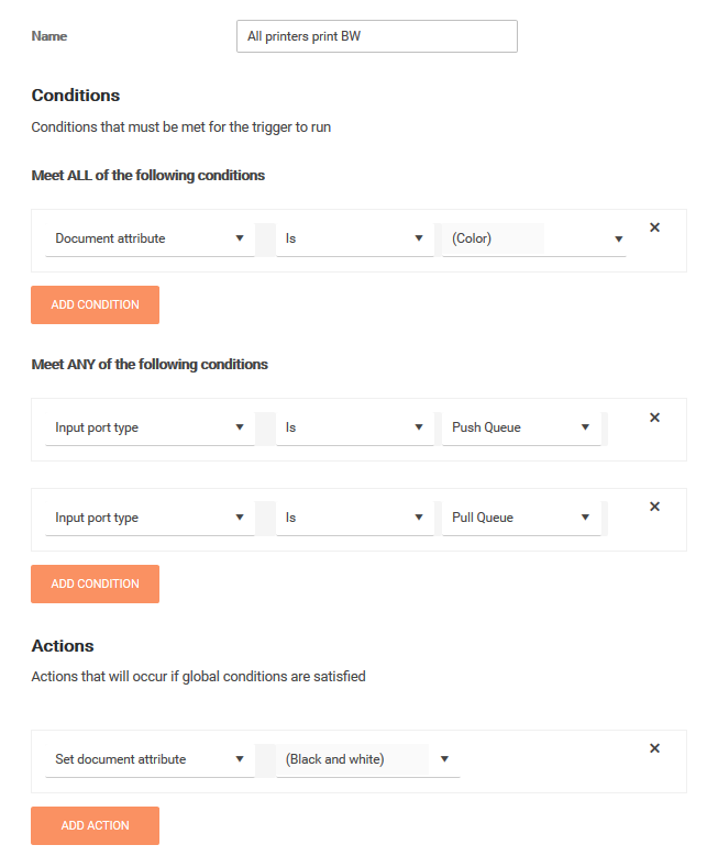 Example of a trigger that sets all jobs to be printed in black and white for every type of queue: