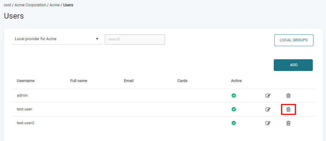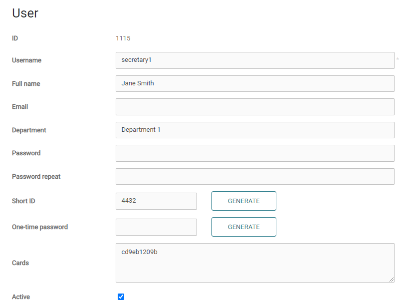 Choose the authentication provider at the top and enter even a partial username or card id to perform a search. Then click to edit the user, to manually modify attributes such as a specific user's password, short ID’s or card ID’s. To edit card ID’s list, you must have the CardManagement permission.