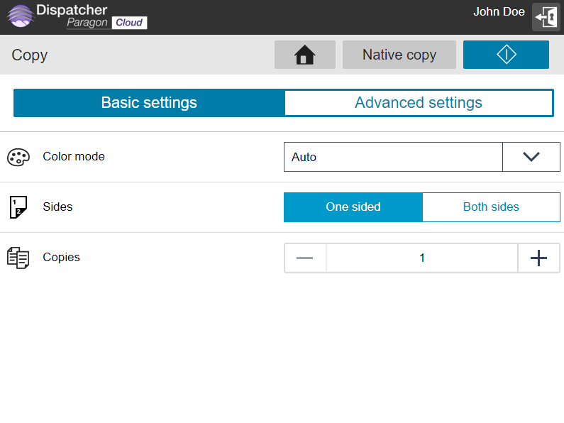 If you wish to use the MFD's Native copy application, tap Native copy on the Copy screen. This works only if the MFD is not in the kiosk mode and if your administrator enabled the button to be seen.