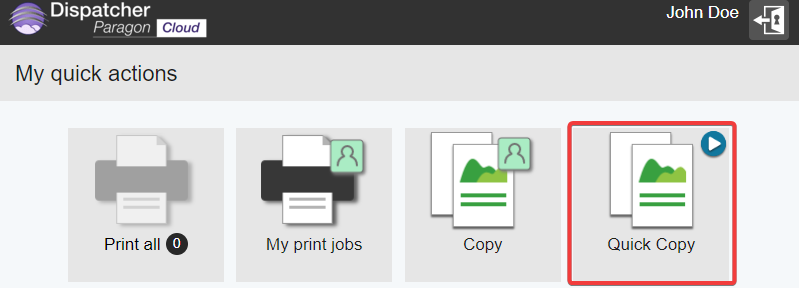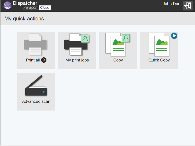My quick actions application enables you to access frequently used functions, such as print all jobs or use a scan workflow immediately after logging in. The quick action buttons are displayed according to your rights and scan workflows assigned to you.If a button has a small play icon in the top-right corner, it means that the action will be executed immediately after you tap the button. No other screen or confirmation action will be displayed.