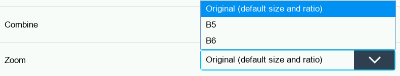 If Paper tray is set to Auto (the default option) the Zoom options are determined by the paper tray sizes available at the MFD. This means that if the device has paper trays with different size formats, such as A3, A4, and B5, those sizes will be displayed as options for Zoom.