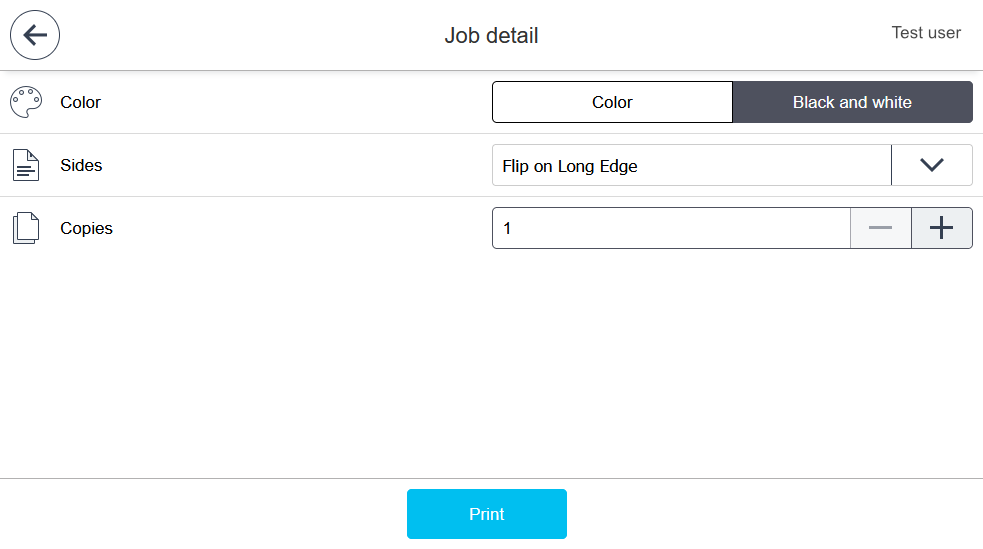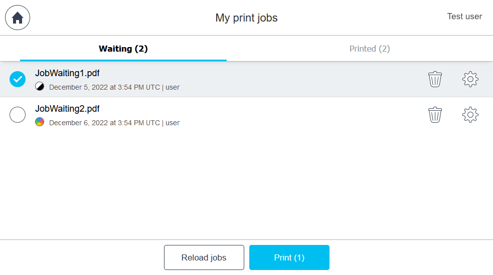 To modify the finishing options (Color, Sides, and the number of copies) before printing, tap the cogwheel icon next to the job.