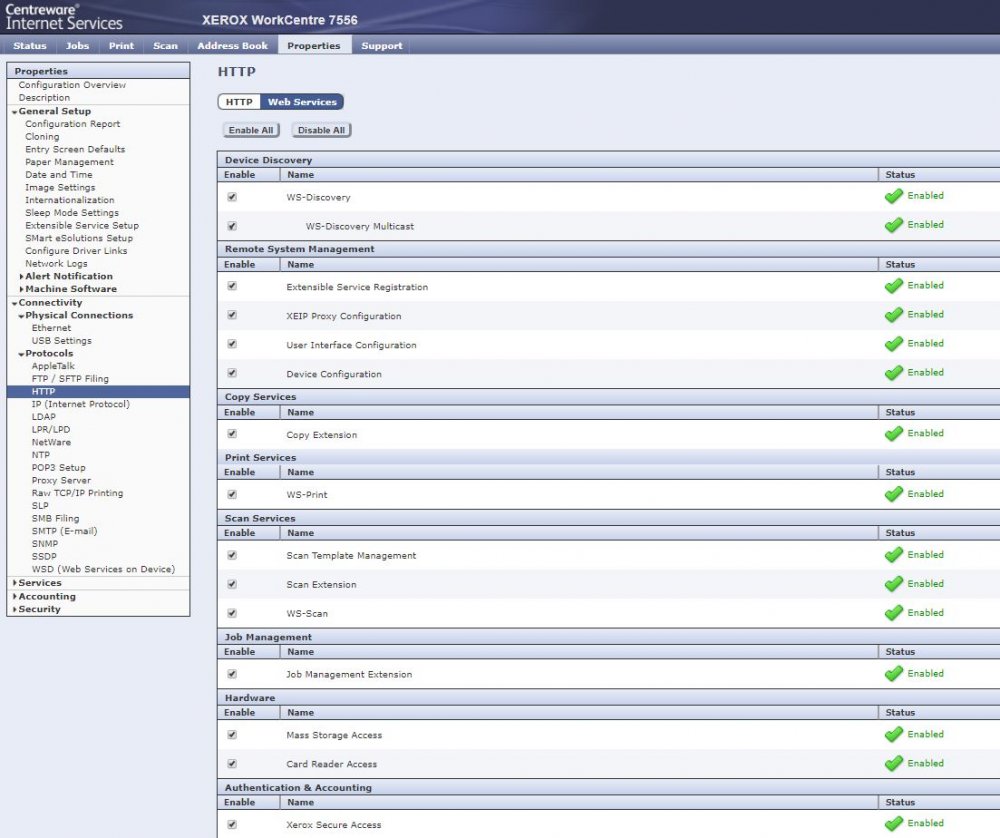 Afterwards push the “Web Services” and activate “Xerox Secure Access”
