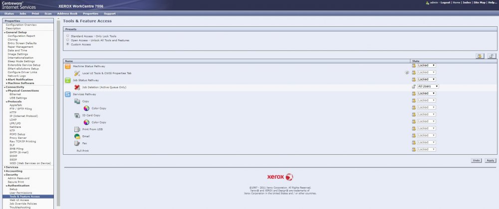 If you want to lock down all functions, set them all to “Locked” in “Authentication” and “Tools & Feature Access”. (Location of these menus can vary depending on model)